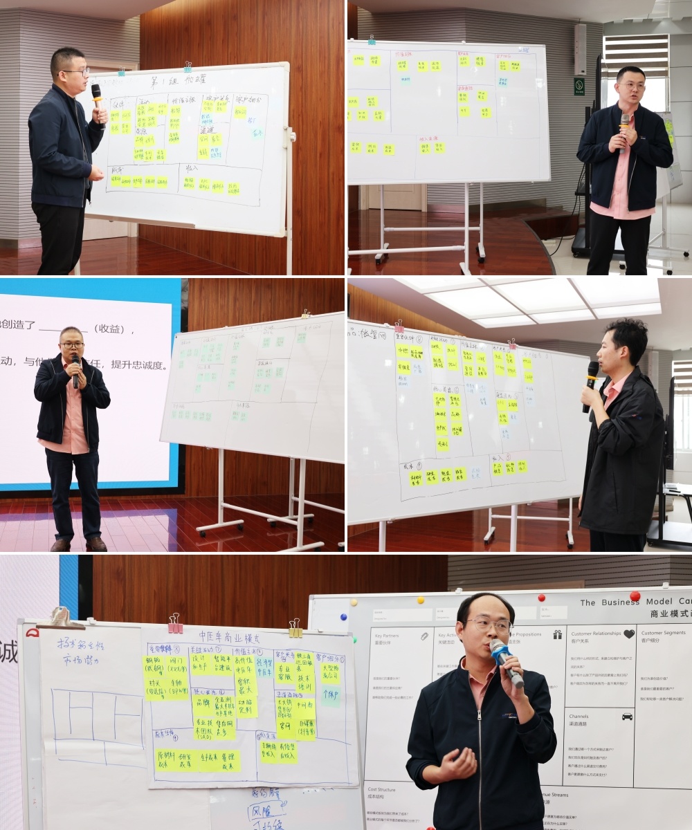 随后,吴老师引导学员结合企业自身的技术优势与业务场景,以微管网、覆土罐、船罐、球罐、中压车产品为小组开展商业模式画布实战演练,从明确目标客户的核心痛点,到设计与之匹配的价值主张,再到规划渠道通路与收入来源,逐步完成各业务商业模式框架搭建,为后续推动企业业务创新与价值增长奠定扎实基础。